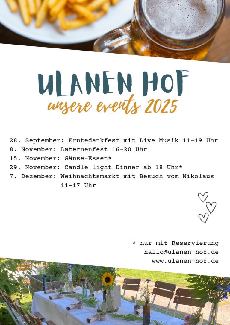 Wir sind für Euch da Liebe Gäste,wir sind ab sofort nicht mehr täglich für euch da, sondern nur zu unseren öffentlichen Events und für eure privaten Feste.Ihr wollt feiern? Kontaktiert uns gerne via hallo@ulanen-hof.de.Herzliche Grüßeeuer Team vom Ulanen Hof